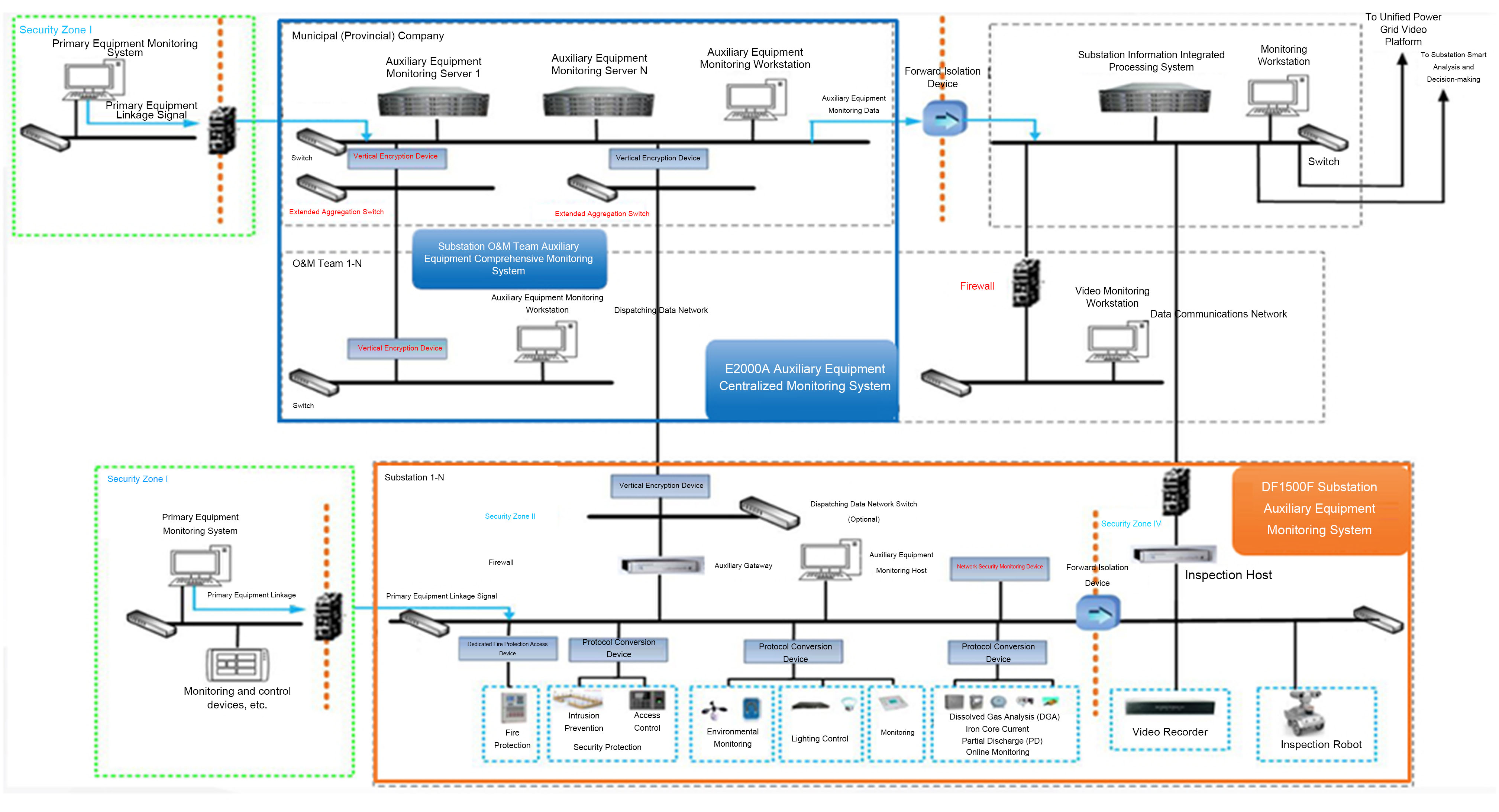 The auxiliary equipment monitoring system includes subsystems such as primary equipment online monitoring, fire protection, security defense, power environment monitoring, intelligent lock control, and intelligent inspection, achieving functions including primary equipment online monitoring, fire alarm, security guarding, power environment monitoring and control, intelligent lock control, classified storage of image monitoring information, intelligent linkage, and comprehensive display. The primary equipment online monitoring, fire protection, security defense, power environment monitoring, and intelligent lock control subsystems are deployed in Security Zone II, while the wireless sensor access and intelligent inspection subsystems are deployed in Security Zone IV. Security Zone II and Security Zone IV are interconnected through forward and reverse isolation devices.